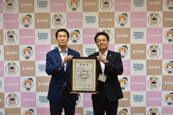 この度苫小牧市より健康経営の取り組みが優良であることが認められ、表彰を受けました。表彰式には宮﨑社長が出席し、金澤市長より表彰状を受け取りました。